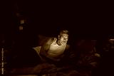 Senior man sitting in bed, illuminated by laptop screen, deeply engrossed in his work while surrounded by a dark room with minimal lighting and modern decor