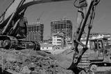 An Excavator and a Cat bulldozer in a construction area with buildings at Istanbul, Kadikoy, Fikirtepe. Fikirtepe District is a reconstruction area at Istanbul.