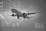 Commercial airplane soaring against a digital of financial data economic movement in industry airline stock analysis, economic reports, or presentations on travel industry trends and investments.