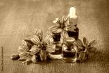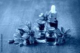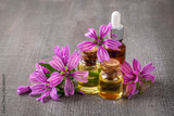 Essential oil bottle with common mallow or Malva sylvestris blossoms