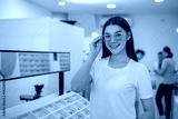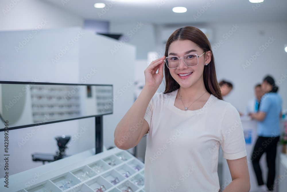 Portrait woman standing display eyeglass frames in optical store or eyewear showroom selecting a pair of glasses as personal style, vision care, and customer engagement in optical environment