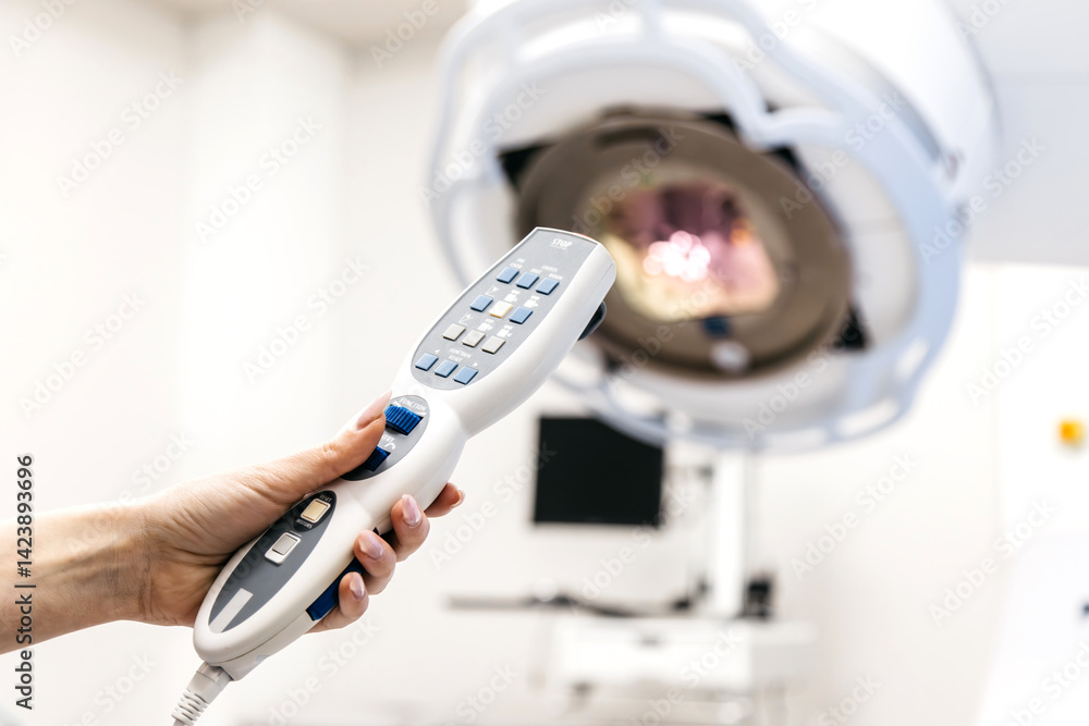 The radiation therapy unit is located in a modern medical facility. The concept of advanced medical equipment in a professional clinical setting.