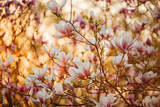 Magnolia flowers blooming in golden hour light. Warm, soft, and elegant spring scene with pink petals and dreamy sunset tones.