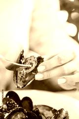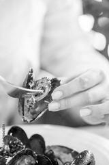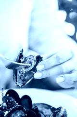 A close-up of a hand holding a mussel with a fork, showing herbs and sauce inside. A bowl of cooked mussels in the background creates a gourmet seafood dining atmosphere.