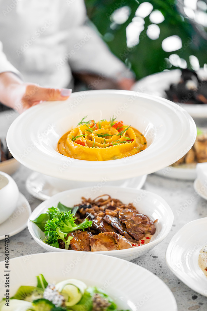Gourmet pasta dish with herbs and red toppings, elegantly presented with surrounding meat and salad plates, creating a refined and appetizing dining setup