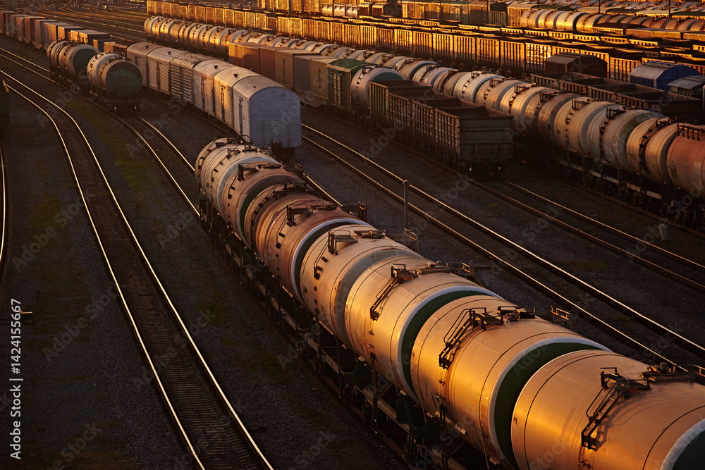 Close-up of wagons and tanks on a railway in the sunset light
