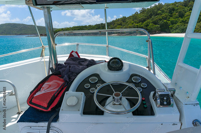 Captains bridge, deckhouse with steering wheel and controls on panel
