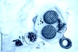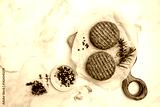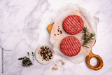 Raw steak burgers patties with ground beef and spices on paper. White background, top view.