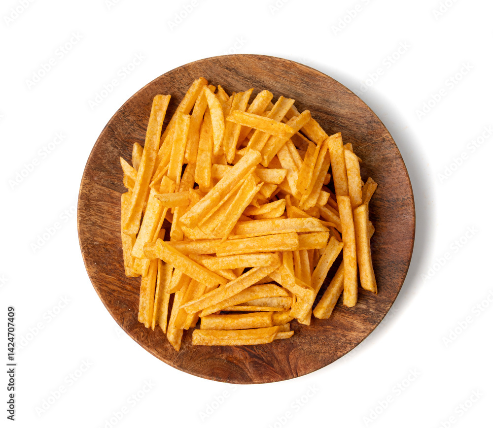 Fried chips sticks isolated, finger potato chips, golden shoestring fries pile, French fries