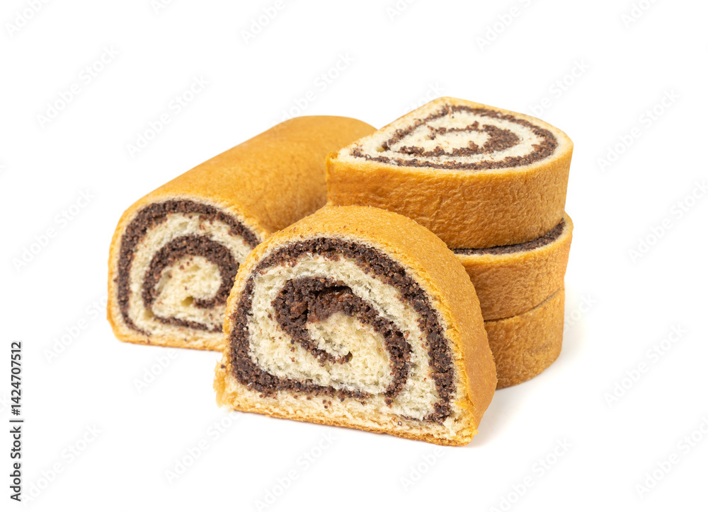 Poppy Seed Swiss Roll, Round Sponge Cake Isolated, Sliced Rolled Vanilla Biscuit with Poppy Seeds Filling
