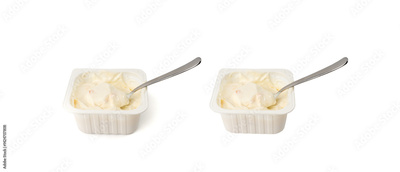 Yogurt cup isolated, yoghurt with orange fruits pieces in plastic pot, spoon in milk pudding