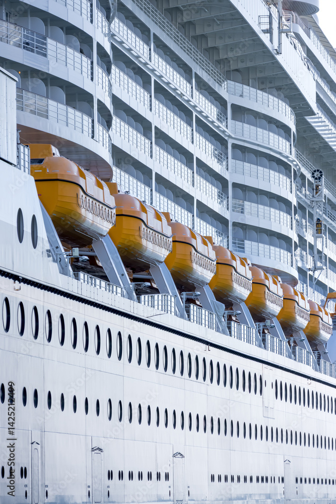 Many yellow life boats on a white tall tourist cruise liner , close up shot