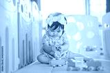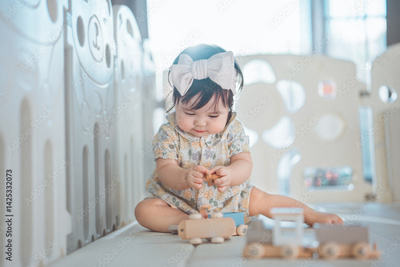 Little asian Infant baby girl 6-12 months playing with toy train at home, Little Toddler having fun in living room, Enhance development.