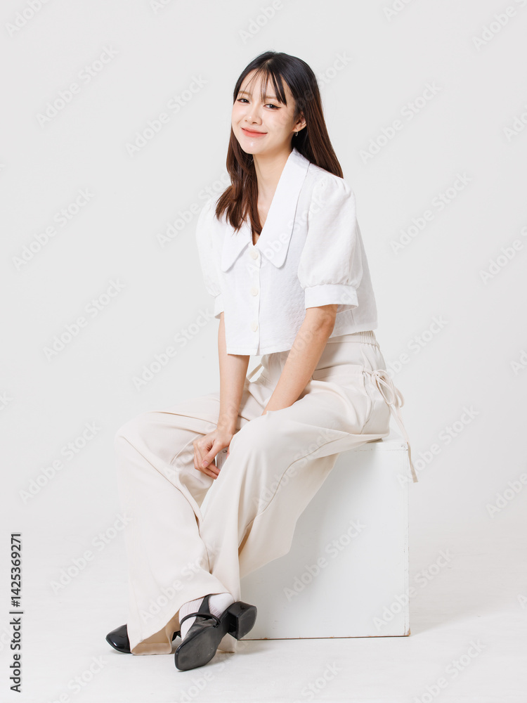 Asian young beautiful pretty happy woman she smiling, cute friendly wearing white shirt white pants sitting on white box pose isolated on white background studio portrait. Lifestyle fashion concept.