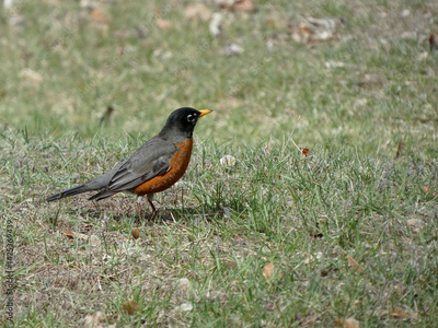 A red-breasted robin foraging in the grass on a sunny day