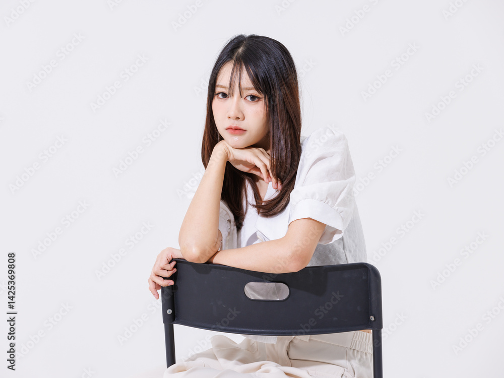 Asian young beautiful pretty happy woman she smiling, cute friendly wearing white shirt white pants sitting on black chair pose isolated on white background studio portrait. Lifestyle fashion concept.
