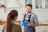 Man plumber talking with female client signing contract for plumbing services at home. Male mechanic or repairman consulting woman customer standing in kitchen. Maintenance and repair service.
