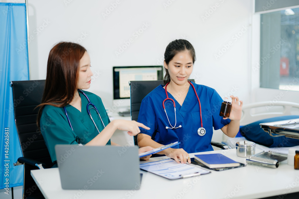doctors and nurses working together in a modern office, showcasing healthcare teamwork, consultation, and professional care