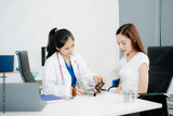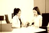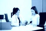 Female doctor explaining diagnosis to her patient. Doctor Meeting With Patient In Exam Room.
