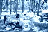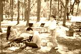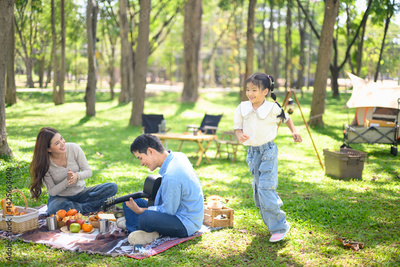 Happy family enjoying outdoor camping picnic with food and guitar music under trees