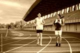 Two asian men are jogging or running together on the racetrack in sports stadium. Outdoor exercise.