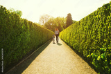Mother and son walking outdoors on the nature background with copy space.