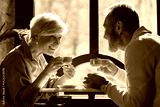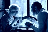 Mature couple enjoying a romantic coffee date in a cozy cafe setting