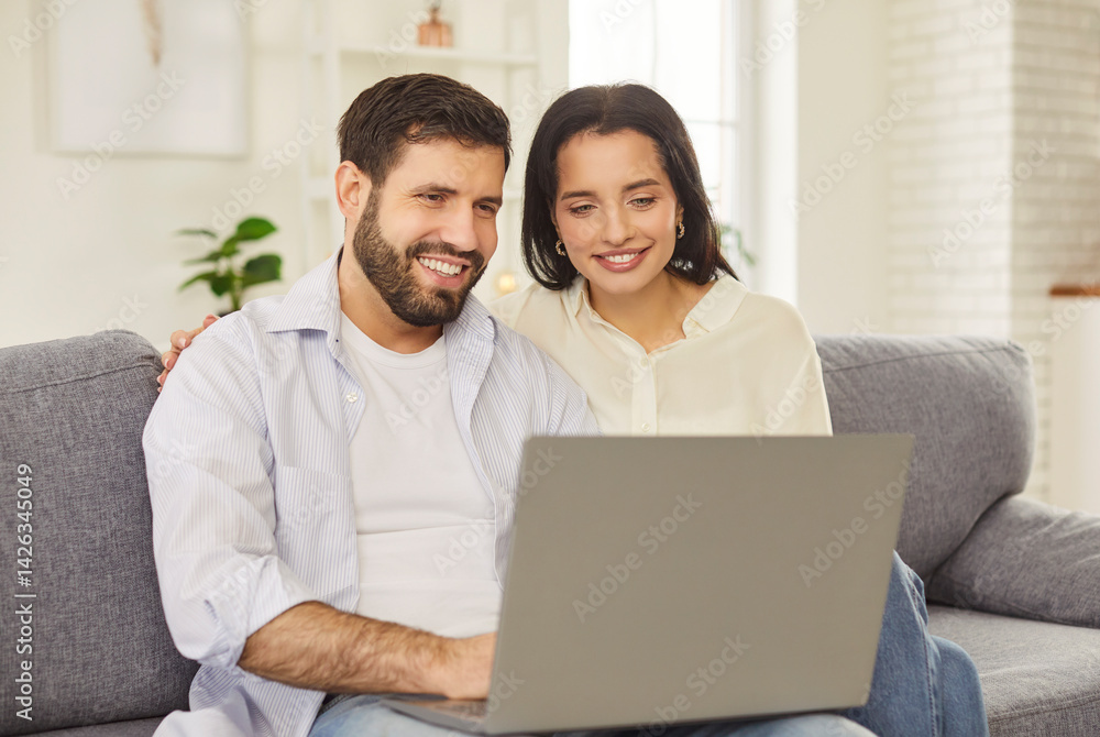 Young cheerful couple sitting on sofa in living room at home using laptop for internet and social media. Happy man and woman resting on couch enjoying weekend watching video on computer.
