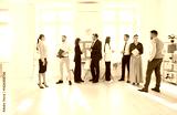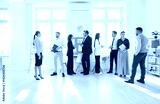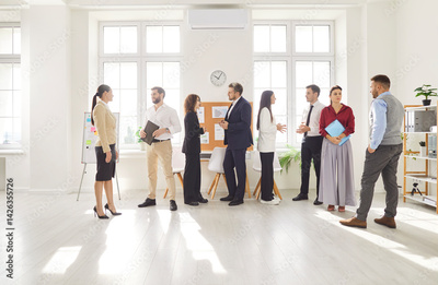 Group of young confident business people men and women talking after a meeting or a conference. Company employees working and discussing job and work projects in the office. Team work concept.