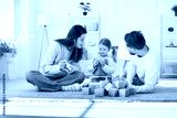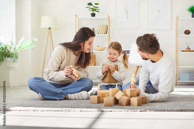 Positive family with daughter enjoys leisure time at home, playing with wooden cubes, sitting on floor. The weekend is spent together, filled with fun, love, and quality bonding moments.