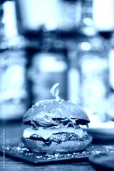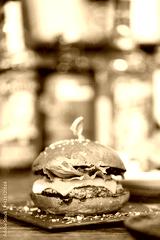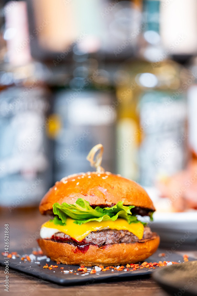 A delicious gourmet hamburger with a juicy beef patty, melted cheese, fresh lettuce, and a toasted sesame seed bun, beautifully presented on a black plate.