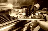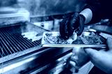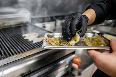 A chef wearing black gloves carefully places grilled shrimp onto a stainless steel tray, showcasing a flavorful seafood dish in a bustling kitchen environment.