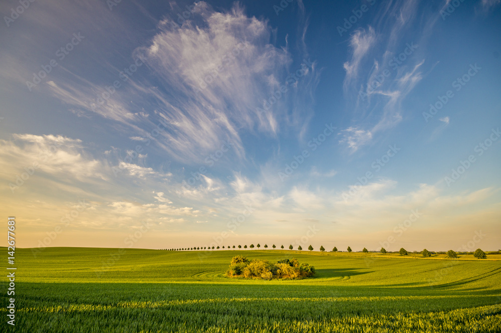 A row of young green trees disappearing behind a horizon in a spring field