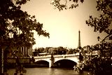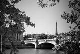 Unusual rare view of Eiffel tower and Pont de la Concorde with a piece of Palais Bourbon to the left, on a bright summer day with clear blue sky, through maple trees