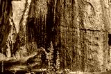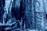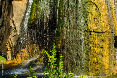 Tropical nature with water running vertically on greenish and yellowish rocks, on bright summer day