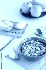 Cornflakes in bowl with fresh apples cut in pieces, bananas, wooden board on white background. Healthy breakfast concept