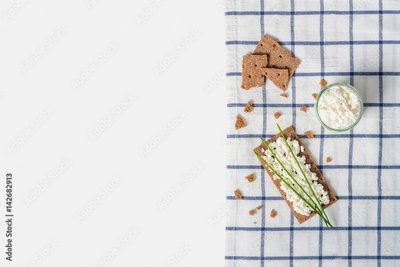 Brown rye crispy bread (Swedish crackers) with spread cottage cheese, decorated with thin green onion, on piece of cloth on white background with space for text, top view. Healthy snack concept