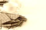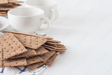 Stack of brown rye crispy bread (Swedish crackers) with two cups and piece of cloth on white background with space for text. Healthy meal concept