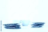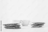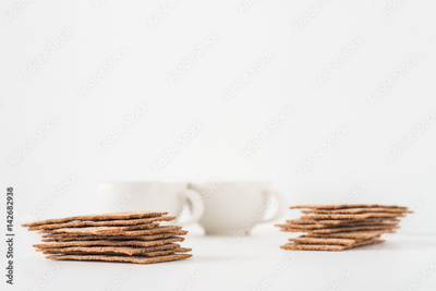 Stacks of brown rye crispy bread (Swedish crackers) with two cups on white background with space for text. Healthy meal concept