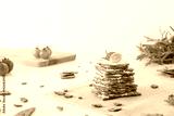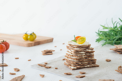 Rye crispy bread (Swedish crackers) stacked in the form of cake in layers with soft cheese, cherry tomatoes and rosemary on white background. Healthy snack concept