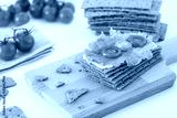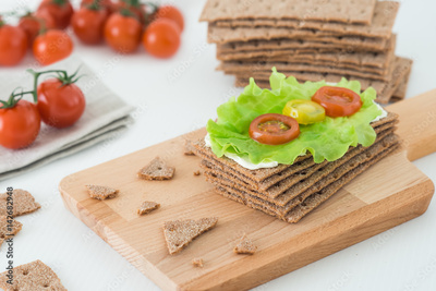 Rye crispy bread (Swedish crackers) with soft cheese, lettuce leave and cherry tomatoes on wooden board on white background. Healthy meal concept