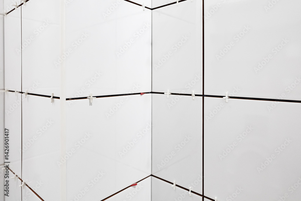 White Ceramic Tiles with Spacers Recently Installed on Wall.