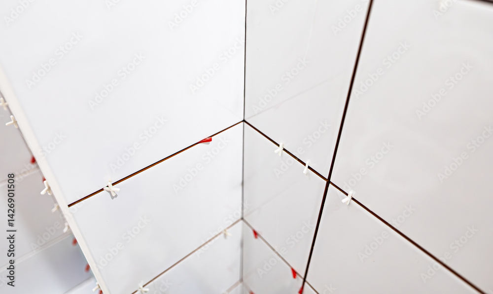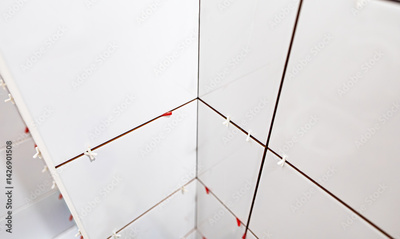 White Ceramic Tiles with Spacers Recently Installed on Wall.