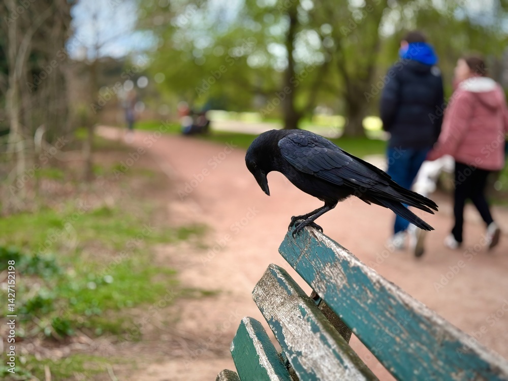 Curious black crow perched on weathered green wooden park bench on a forest path during early spring, with blurred background of walking people and relaxing visitors