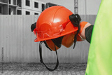 Worker in a high-visibility vest holds an orange hard hat with safety gear at a construction site, emphasizing workplace safety.