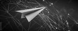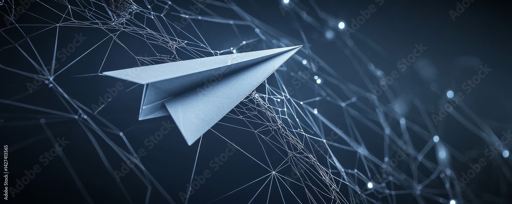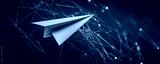 A paper airplane flying through a digital network, representing innovation and creativity.