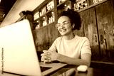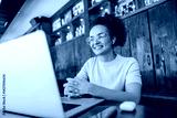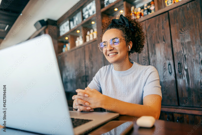 Portrait of freelancer having conference call on laptop in working friendly coffee shop.