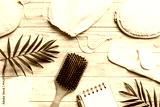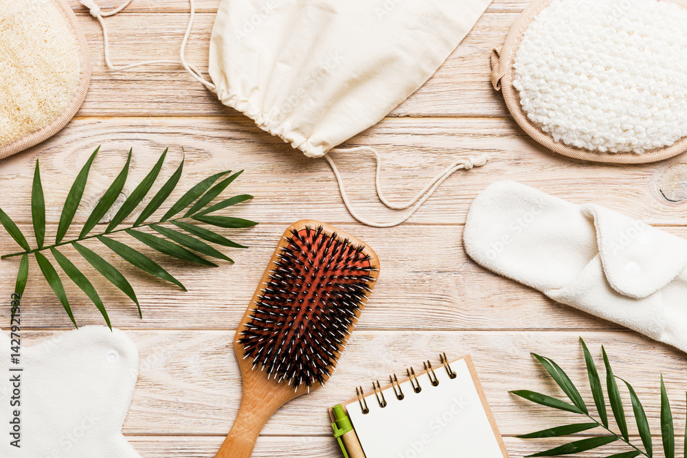 Zero waste concept. Eco-friendly home daily accessories. top view