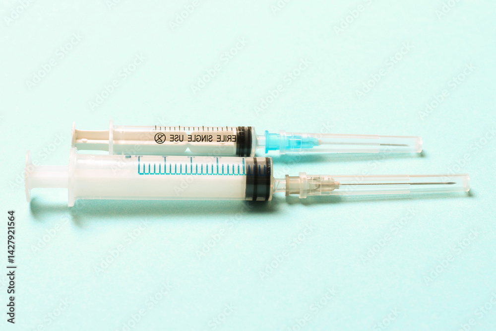 Top view of medical syringes on colorful background. Health care concept with copy space
