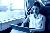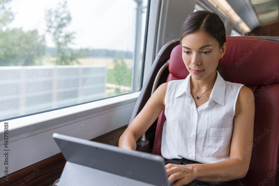 Businesswoman working on laptop on train. Asian freelance writer or designer writing emails on computer while commuting to meeting in the city. Commuter woman urban travel.